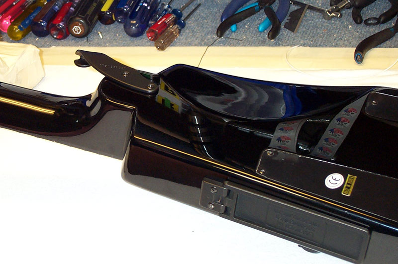These pre-production units had screwed in covers but the next production ones will have flip up battery compartments. One nice addition are two holes in the tuner end where the allen wrenches are stored. The two that are included allow you to make all adjustments to the headpiece and bridge (pickups retain standard Philips head).