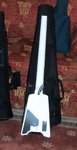 comfortable fit. Both guitar and bass have a strap bar that extends out from the body to mimic a horn. On the bass they even extend the body a little bit more on the top and the bar is longer to provide even more extension for balance. This replaces the pivot plate design. The input jack is directly behind the bridge and faces out the tuner end so the cord stays out of the way. Folding leg rest was pretty standard design. It's new, but didn't notice any major changes. Battery placement is the same general area as before.